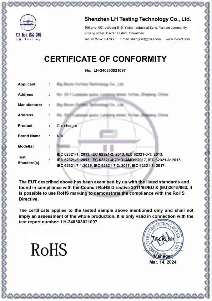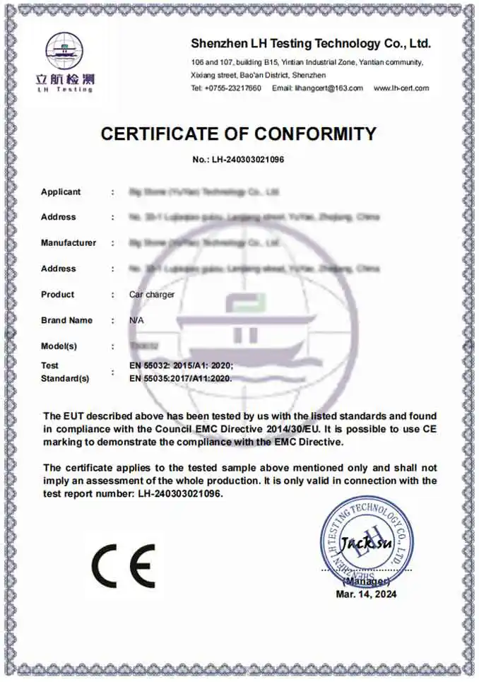उत्तर: एक पेशेवर कारखाने के रूप में, हमारे उत्पाद पूरी तरह से अंतरराष्ट्रीय सुरक्षा और पर्यावरण मानकों के अनुरूप हैं। हम CE और RoHS प्रमाणित उत्पाद प्रदान करते हैं। इसके अलावा, हमारी उत्पादन सुविधा बीएससीआई और आईएसओ प्रमाणित है, जो यह सुनिश्चित करती है कि हमारे कार चार्जर एडाप्टर प्रीमियम वैश्विक ब्रांडों द्वारा आवश्यक कठोर तकनीकी और नैतिक मानकों को पूरा करते हैं।