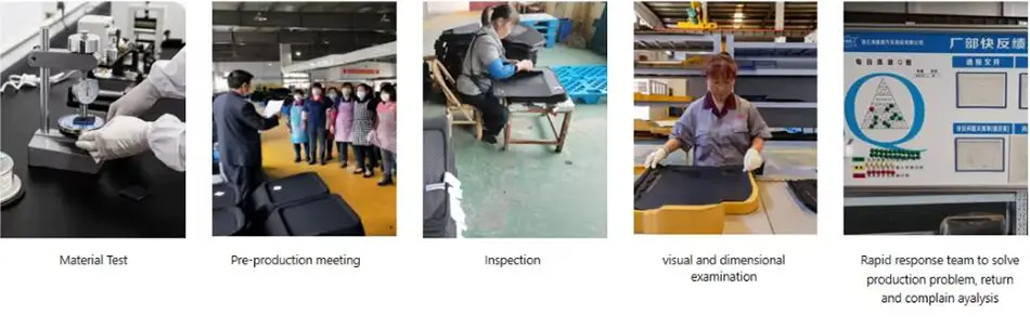 हम कार मैट के डिजाइन और निर्माण के लिए ISO9001, गुणवत्ता नियंत्रण के लिए ISO/TSI16949, पर्यावरण प्रबंधन के लिए ISO14001:2015, सामाजिक जिम्मेदारी के लिए BSCI और कच्चे माल के लिए EU REACH मानकों का पूरी तरह से अनुपालन करते हैं। हमारे पास स्व-जांच करने के लिए इन-हाउस परीक्षण सुविधाएं हैं ताकि यह सुनिश्चित किया जा सके कि हमारे उत्पाद एसजीएस, इंटरटेक, या किसी अन्य तृतीय पक्ष निरीक्षक द्वारा किए गए परीक्षणों को पास करते हैं जिनकी ग्राहकों को आवश्यकता हो सकती है।