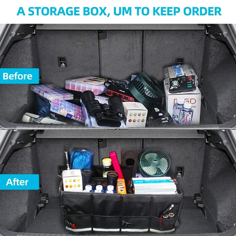 तीन मुख्य डिब्बे उपकरण, भोजन, खेल गियर, क्लीनर और आपातकालीन वस्तुओं को व्यवस्थित करते हैं। चार जालीदार साइड पॉकेट में तौलिए या कार्ड जैसे छोटे सामान रखे जा सकते हैं। एक सामने की ढक्कन वाली जेब बाधाओं और सिरों को सुरक्षित करती है। यह ट्रक, सेडान, एसयूवी, वैन और लगभग किसी भी वाहन में फिट बैठता है।