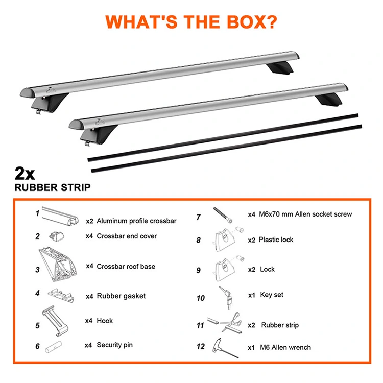 फ्लश साइड रेल वाले वाहनों के लिए इंजीनियर किए गए, ये रूफ रैक क्रॉस बार्स सामान, बाइक या कैंपिंग गियर के परिवहन के लिए एक मजबूत मंच प्रदान करते हैं। 14 किलोग्राम का हल्का निर्माण संक्षारण-प्रतिरोधी एल्यूमीनियम मिश्र धातु और प्रभाव-प्रतिरोधी प्लास्टिक को जोड़ता है, जो स्थायित्व सुनिश्चित करता है। सहायक उपकरण में 2 चाबियाँ, एक हेक्स रिंच, एक निर्देश पुस्तिका और त्वरित स्थापना के लिए एक पीवीसी पट्टी शामिल है।