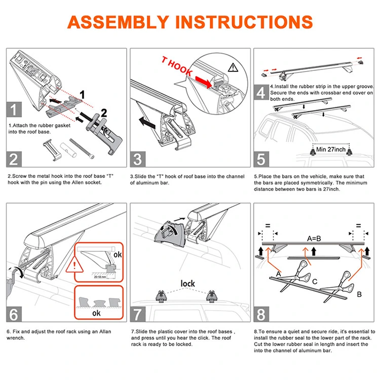 इन रूफ रैक क्रॉस बार्स की स्थापना आसान है: 10 मिनट के सेटअप के लिए हेक्स रिंच शामिल है; चरण-दर-चरण चित्रण के साथ मैनुअल।